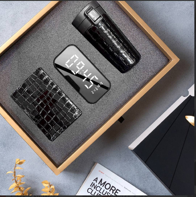 این ست شامل تراول ماگ باکیفیت، اسپیکر بلوتوث ساعتدار رومیزی، دفترچه یادداشت و پایه موبایل است که در یک جعبه شیک و خاص قرار گرفتهاند.
